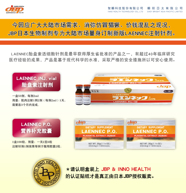 LAENNEC 胎盘素活细胞针剂是最早获得厚生省批准的产品之一,有超过40年临床研究医疗经验的成果,JBP以独特的技术,能有效地提取人类胎盘中各种生物活性物质而制成医疗用的药品,对于受损的肝脏,促进肝实质细胞的增值,进行修复。此外,基于现代科学的水平采取严格的安全措施,所以可以安心使用。